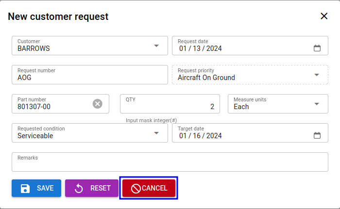 - Сохранение запроса, кнопка будет активна только если партийный номер был найден в системе; После сохранения запроса поля 4, 5, 7, 8 будут сброшены.