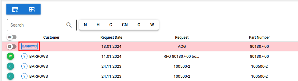 При выборе New запрос появится со статусом новый, а возле имени клиента появится буква Q на красном фоне. Это означает, что запрос имеет актуальное предложение поставщика на этот или альтернативный партийный номер.