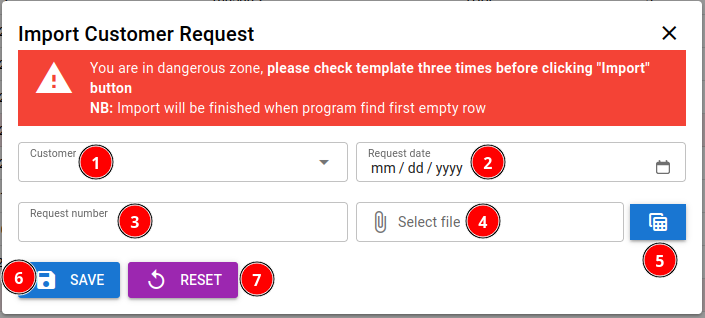 При необходимости внесения больших запросов от одного клиента возможно выполнить автоматизированный импорт запросов, для этого необходимо нажать на кнопку № 2 основного окна.